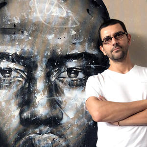 Mario is a prolific portraitist who is fascinated by the unpredictability of human behaviour, from brief glances to the impermanence of facial expressions. He uses unconventional and rough materials such as cardboard, reversed canvases, and hardware tools, painting abruptly and spontaneously. His approach relies on drippings, splashes, and paint throws, revealing the physicality of the painting process in the final piece.